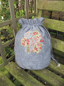 | Round bottom bags; Liberty and jeans cushion; First quilt for me!; Oakshott curve-pieced cushion |